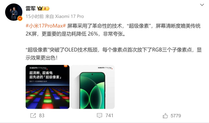 IT 之家注意到,小米创办人、董事长兼 CEO 雷军补充介绍了新机屏幕,他称小米 17 Pro Max 屏幕采用了革命性的技术,「超级像素」,屏幕清晰度媲美传统 2K 屏,更重要的是功耗降低 26%,非常夸张。