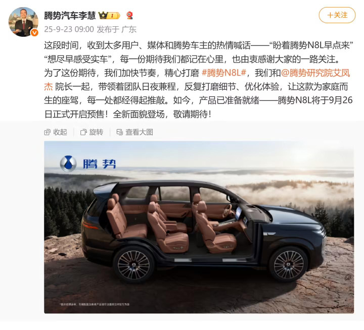 9 月 23 日消息,比亚迪腾势汽车总经理李慧今天在微博公开了腾势 N8L 汽车的内饰官图,新车将于 9 月 26 日开启预售。
