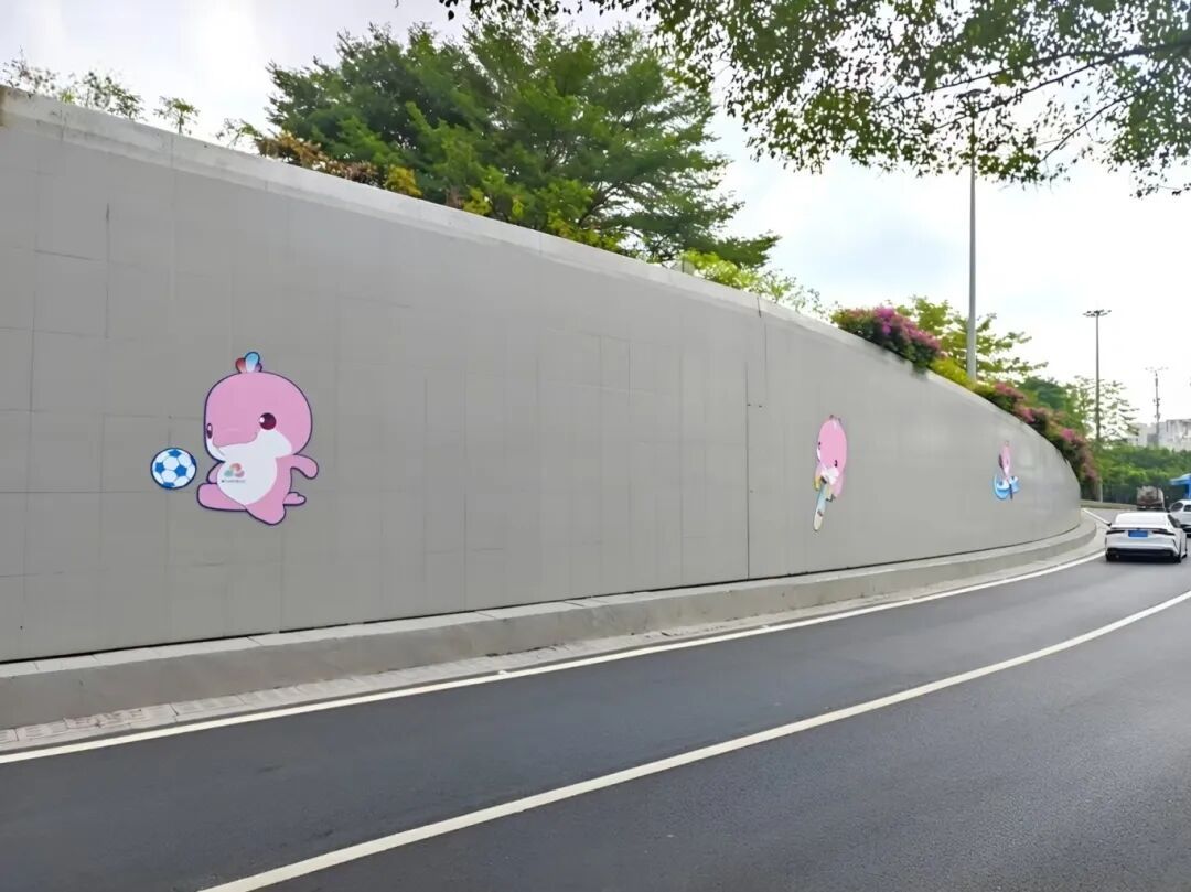 奥体隧道内,十五运会和残特奥会吉祥物“喜洋洋”“乐融融”的运动身姿跃然壁上,憨态可掬又动感十足,让隧道穿行充满趣味。