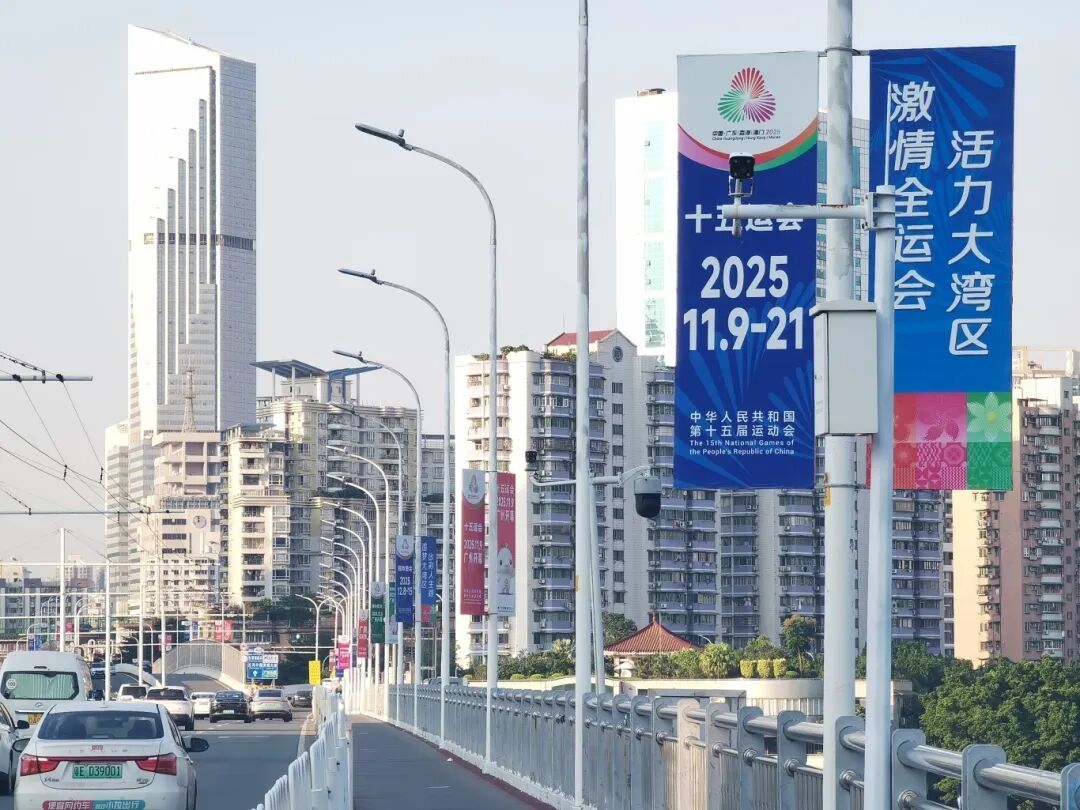 桥梁涂装也是本次提升的重点,四座跨江桥梁累计完成桥体涂装约3.22万平方米,使桥梁外观更加整洁美观。江湾大桥上,全运主题道旗沿江岸飘扬,与珠江波光相映生辉。